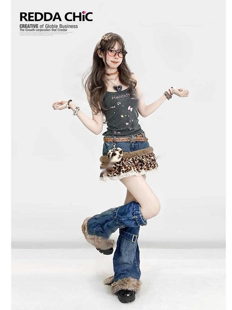 American Retro Y2K Chic Girls Cake-Style Leopard-Print Patchwork Lace Denim Skirt