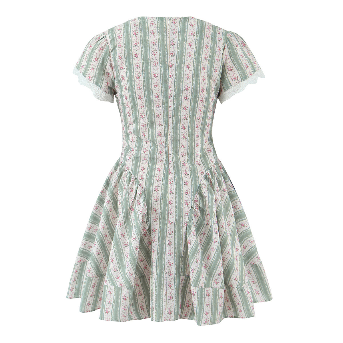 French-style Floral Print Bow-Detailed Striped Lace V-Neck Mini Dress